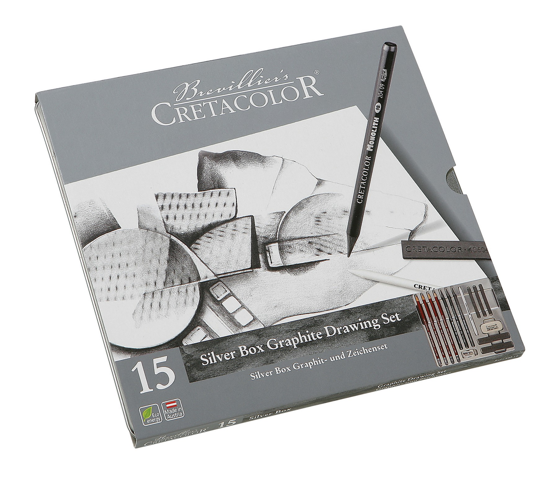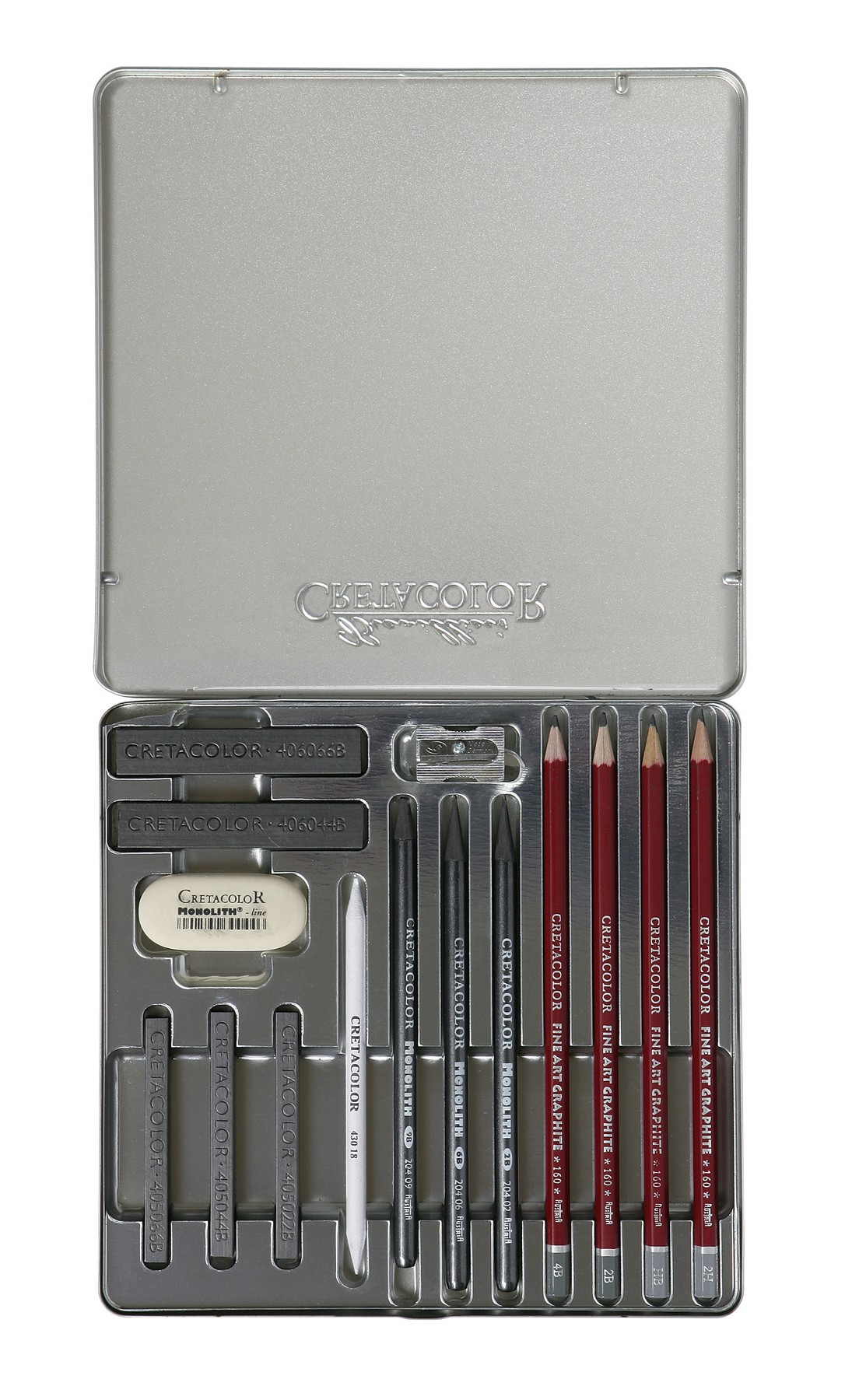 В составе набора CretacoloR Silver Box: 4 профессиональных чернографитовых карандаша 2H, HB, 2B, 4B; 3 чернографитовых карандаша Monolith 2B, 6B, 9B; 3 чернографитовых палочки 7x7 мм 2B, 4B, 6B; 2 графитовых палочки 7x14 мм 4B, 6B; ластик Monolith; растушёвка 6 мм; точилка Monolith