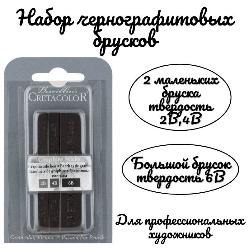 Набор чернографитовых брусков Cretacolor в блистере, 2 маленьких бруска твердость 2В,4В, большой брусок 6В