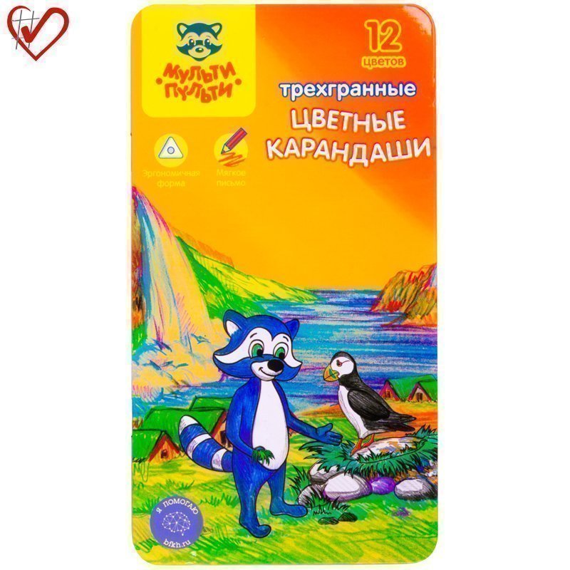 Карандаши цветные Мульти-Пульти "Енот в Исландии", 12 цветов, трехгранные, метал. пенал