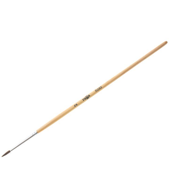 Кисть из волоса Козы, круглая. Волос длинный, мягкий и упругий, хорошо держит краску и не оставляет следов на поверхности. Применяются кисточки из ворса козы при работе с акварелью, каллиграфии, в работе с керамикой. Выдерживает температуру горячего воска, поэтому используют в горячем батике. Обойма выполнена из полированного алюминия. Ручка изготовлена из качественной древесины березы, покрыта глянцевым эко-лаком. На каждой кисти есть индивидуальный ШК