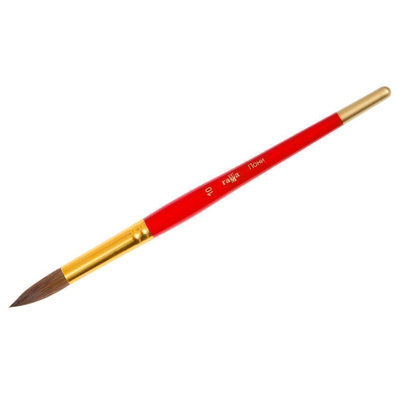 Кисть из волоса Пони, круглая. Волос кисти - средней жёсткости, ближе к мягкому. Волос надежный и долговечный. Идеальны для начинающих художников и детских образовательных учреждениях. Используют для красок: акварель, гуашь. Обойма выполнена из полированного алюминия с золотистым напылением. Ручка изготовлена из качественной древесины березы, покрыта глянцевой эмалью красного цвета. На каждой кисти есть индивидуальный ШК