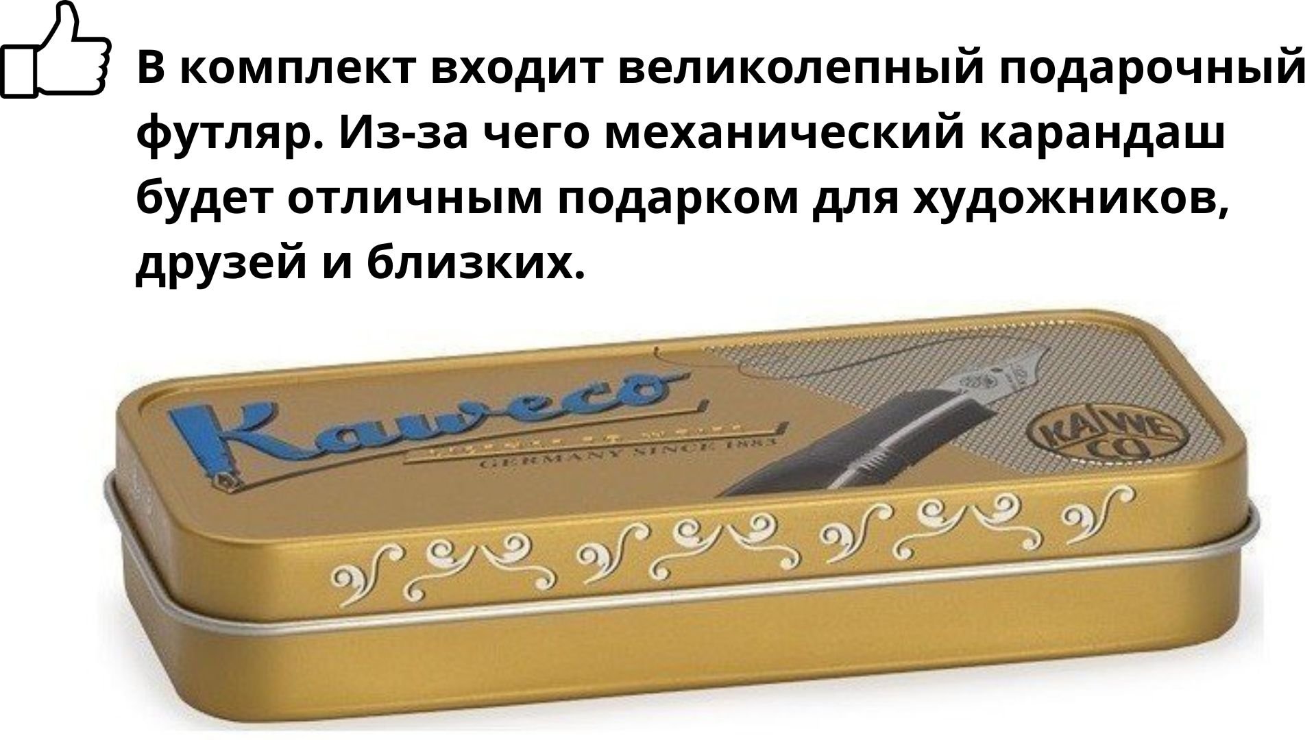 • В комплекте с карандашом идет подарочный футляр, благодаря которому карандаш станет отличным подарком для художников, друзей и близких.