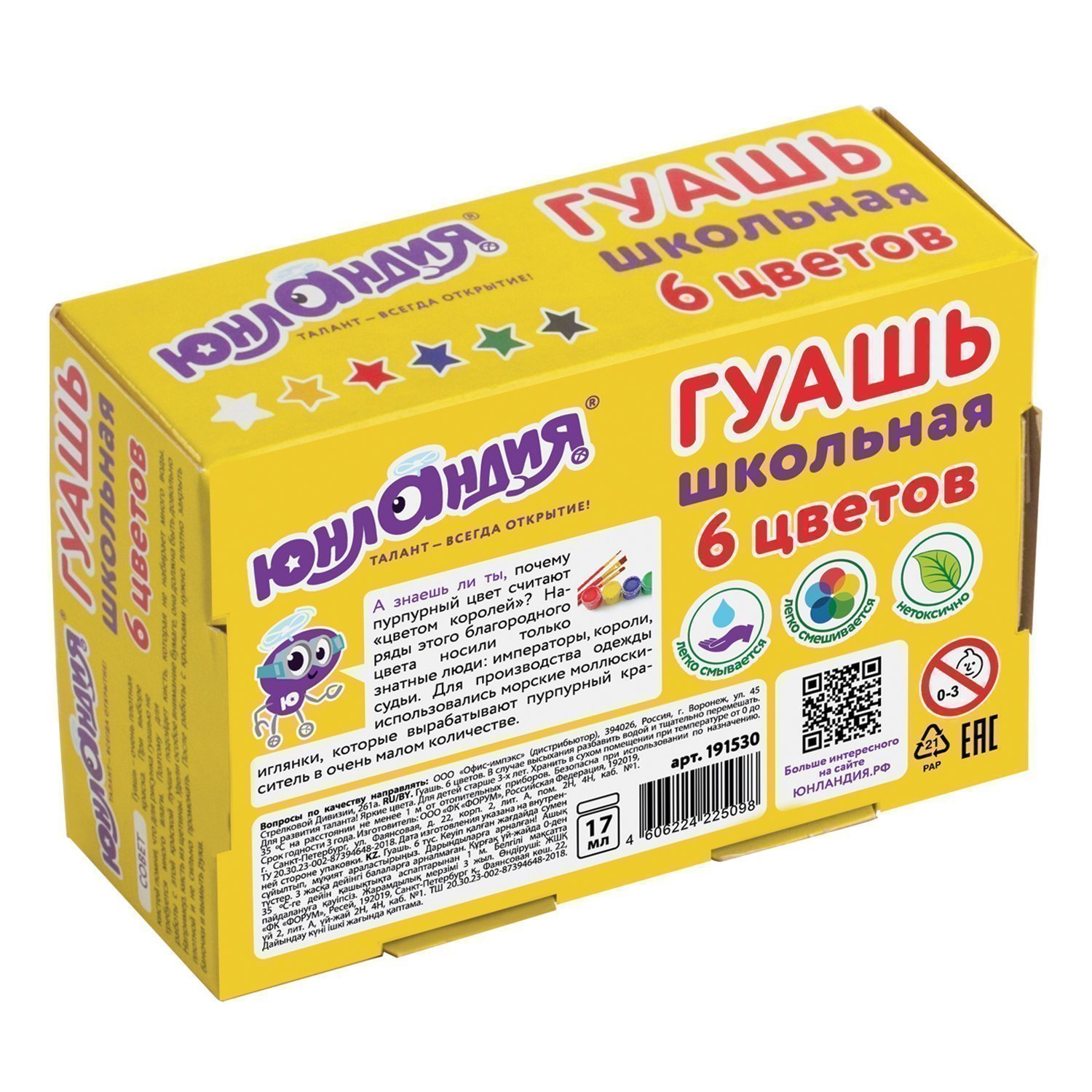 Гуашь ЮНЛАНДИЯ "ШКОЛЬНАЯ" 6 цветов 191530