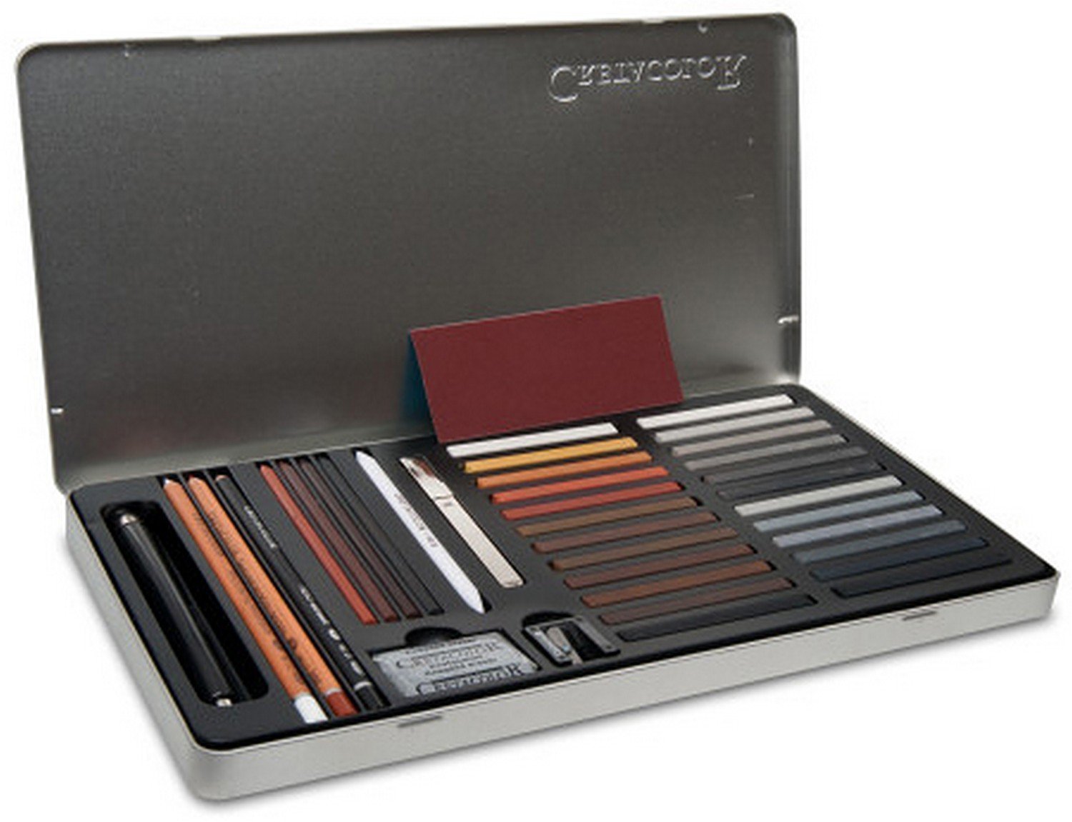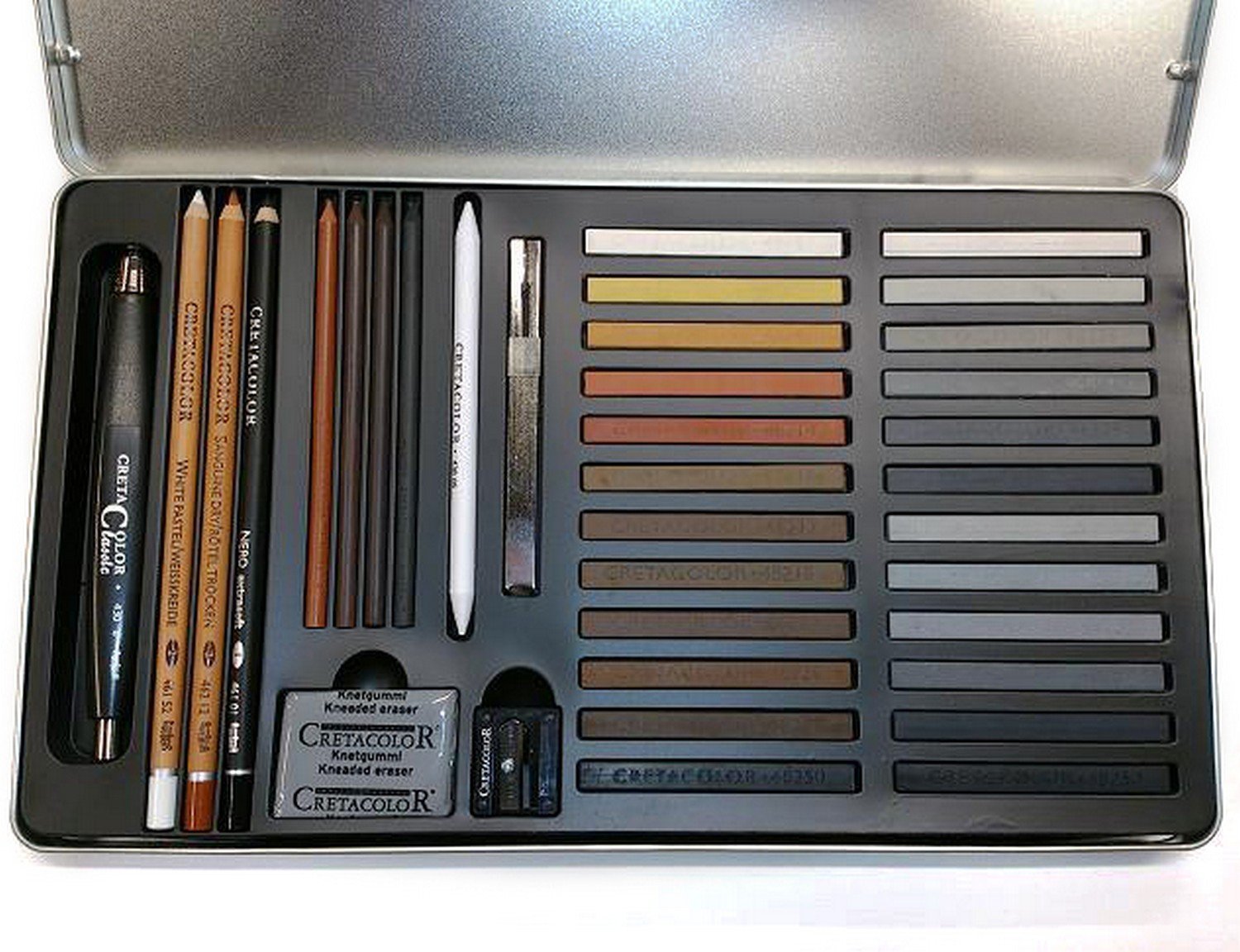 Набор «Terra Classica» Набор содержит полный ассортимент художественных материалов для всех техник работы с сангиной: 24 мелка оттенков коричневого и серого, художественные карандаши (белый мел, сухая сангина, «Nero»), стержни 5,6 мм (угольный, светлая и тёмная сепия, сангина масляная), точилку для художественных карандашей, ластик-клячку, растушёвку, держатель для мелков, держатель для стержней и наждачную бумагу.