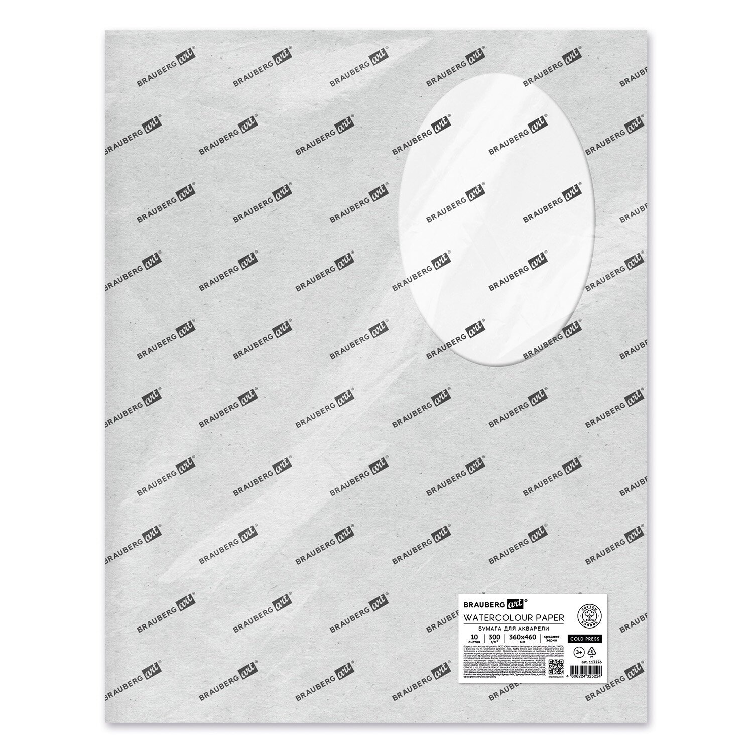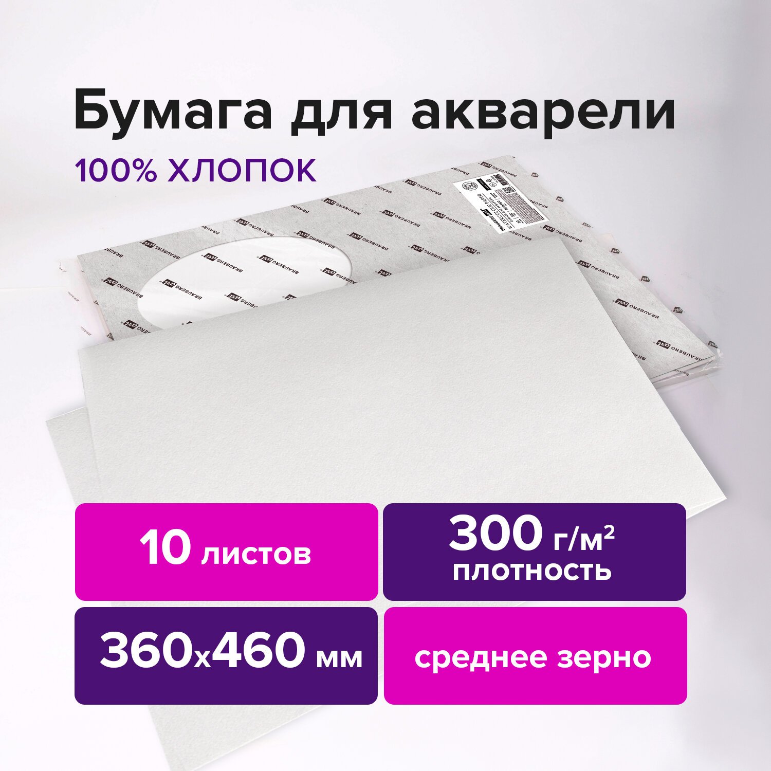 Бумага для акварели ХЛОПОК 100%, 300 г/м2, 360x460 мм, среднее зерно,10 листов, BRAUBERG ART "PREMIERE", 11322