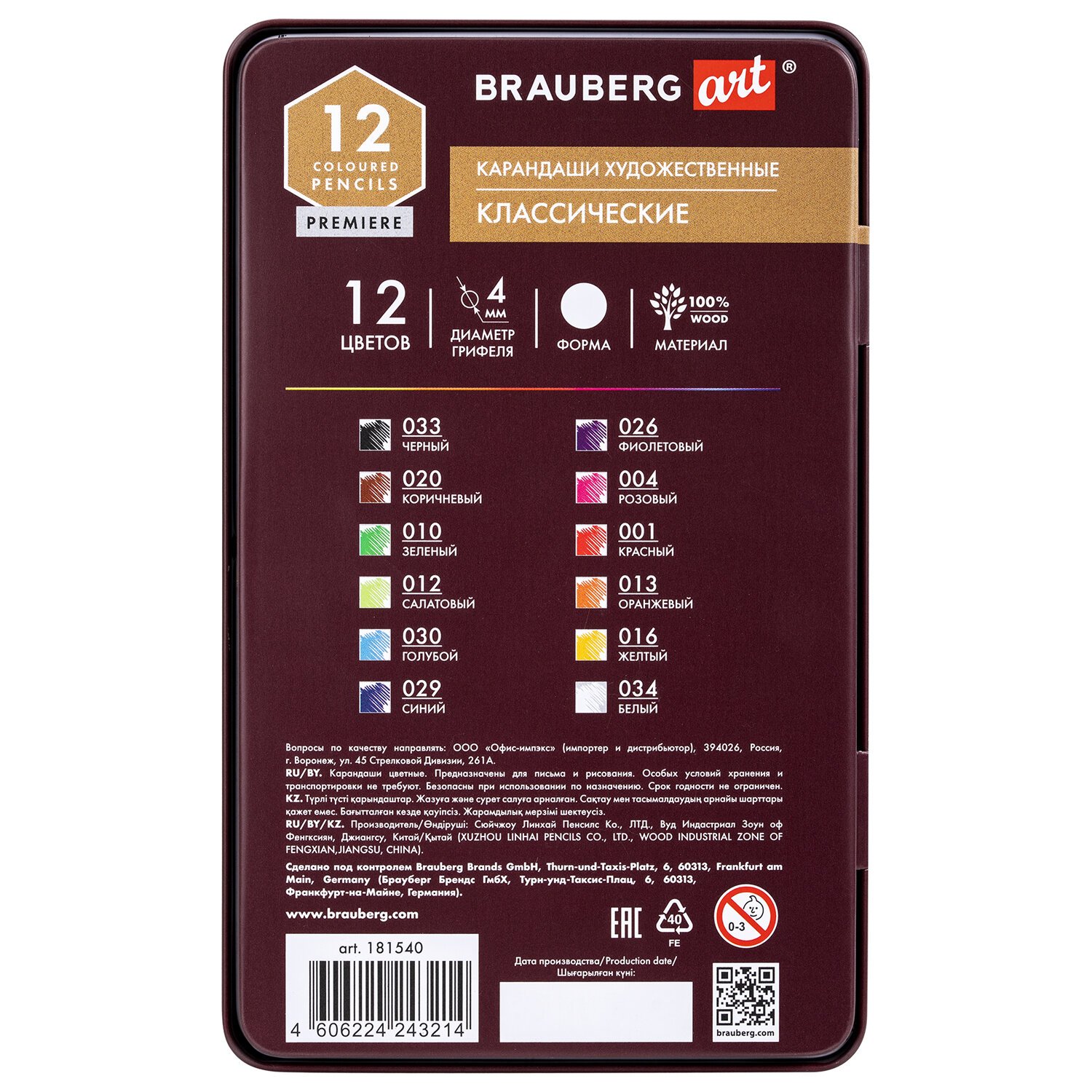 Карандаши художественные цветные BRAUBERG ART PREMIERE, 12 цветов, МЯГКИЙ грифель 4 мм, металл, 181540
