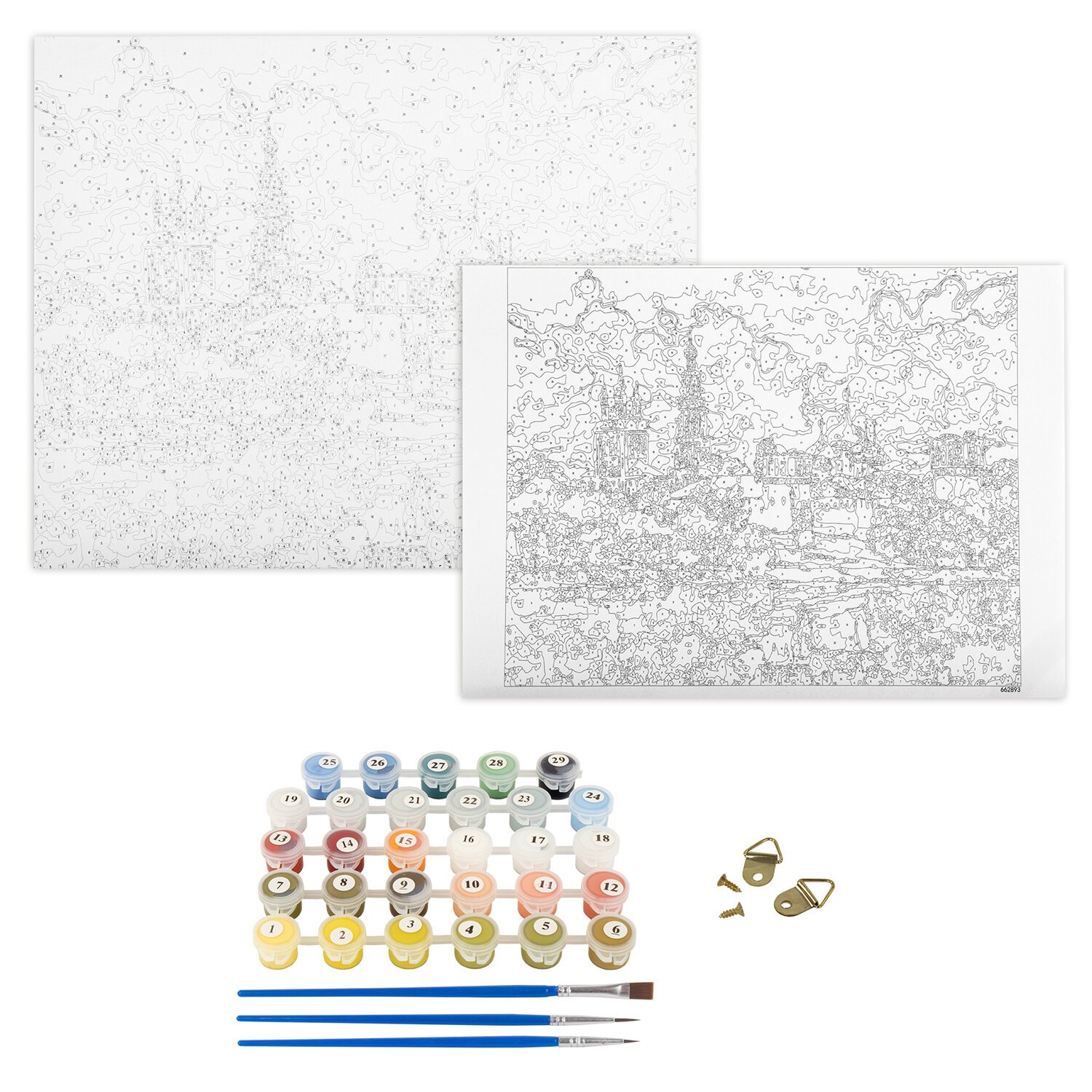 Представлен эксклюзивный сюжет по картине российского художника Разживина И.В. В набор входит: 1 хлопковый холст на подрамнике с контуром, 1 лист бумаги для тренировки, набор из 29 акриловых красок объемом 3 мл каждая, 3 синтетические кисти и комплект металлических креплений для подвешивания на стену. Краски укрывистые, быстро сохнут без потери цвета. Каждый цвет в наборе подходит под конкретный номер, благодаря чему нет необходимости смешивать краски. Однако, если Вы хотите добиться нового оттенка, наши краски с легкостью позволят это сделать благодаря отличной смешиваемости. 3 синтетические кисти разного размера идеально подойдут для закрашивания элементов различной сложности. Холст из 100% хлопка плотностью 290 г\м2 с высококачественной печатью и отличным натяжением. При работе с картиной дополнительно могут понадобиться: емкость с водой для мытья кисти и салфетка для удаления воды с кисти (В КОМПЛЕКТ НЕ ВХОДЯТ). Подходит для потребителей всех возрастов от 8 до 80 лет. Поставляется в картонной упаковке с ручкой.