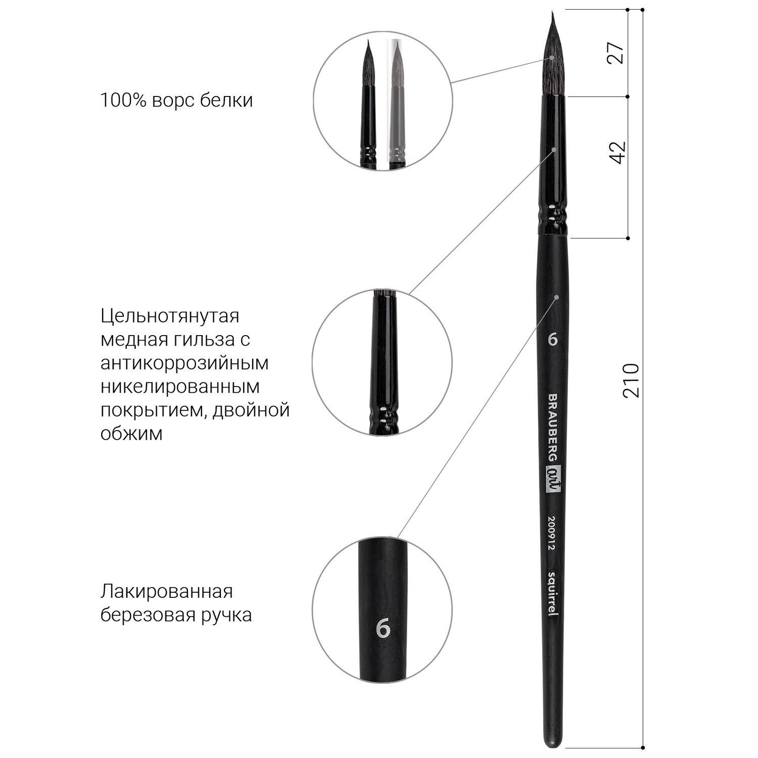 Кисти из волоса белки отлично впитывают и отдают краску, хорошо держат форму, долговечны и надежны. Кисть № 6 позволит комфортно прорисовывать как мелкие, так и крупные детали. Короткая ручка покрыта лаком, что защищает ее от воздействия красок и влаги. Форма пучка - круглая. Упаковка - ОПП-пакет с европодвесом и картонной подложкой.
