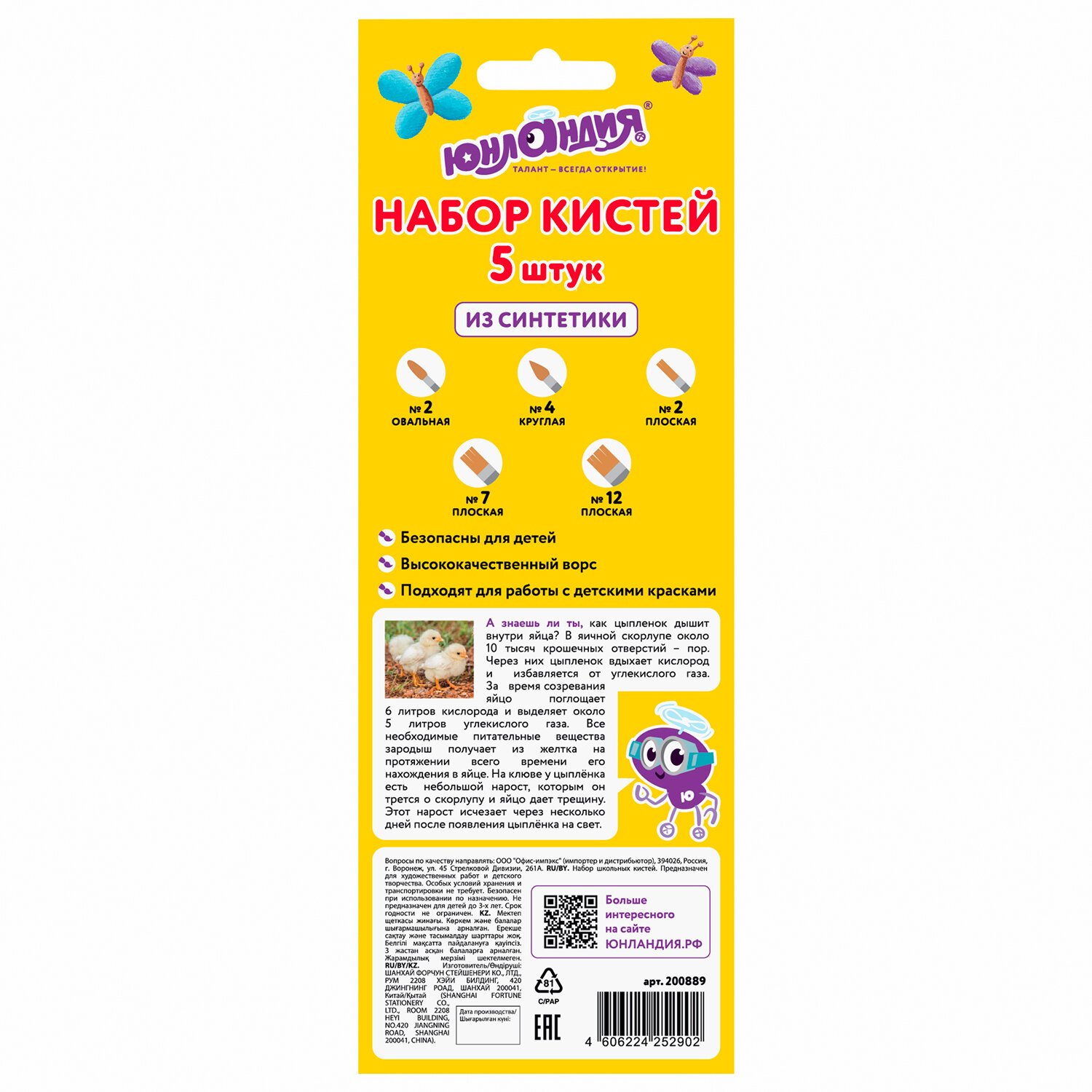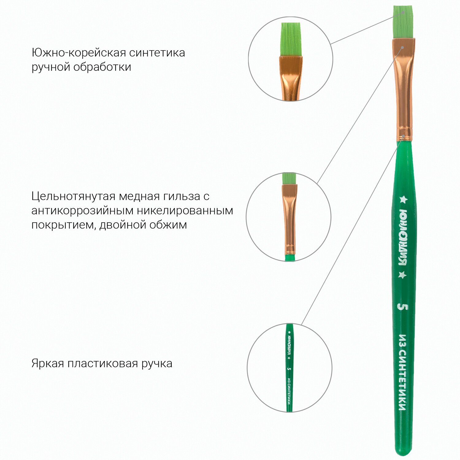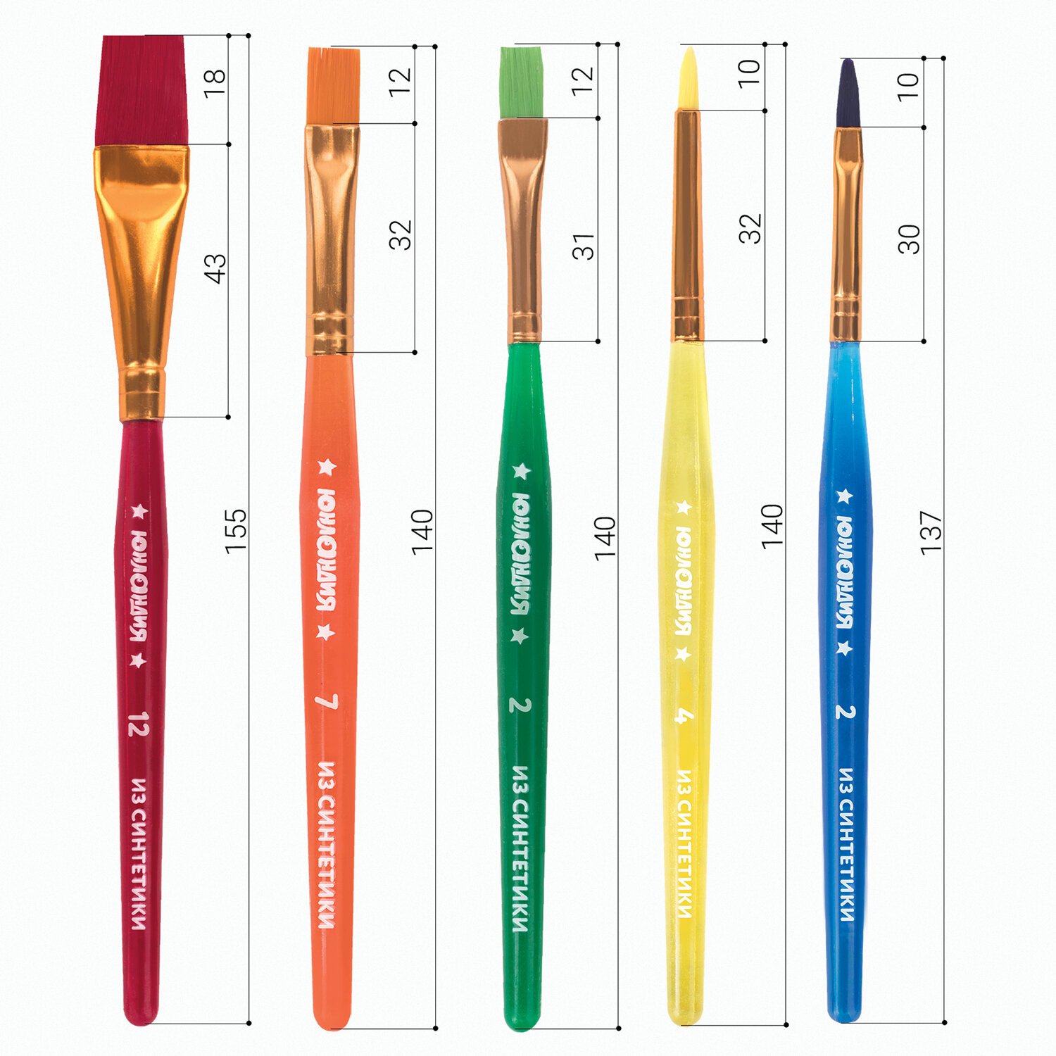 Кисти ЮНЛАНДИЯ, набор 5 шт. (синтетика, круглая №4, плоские №2, 7, 12, овальная №2), блистер, 200889