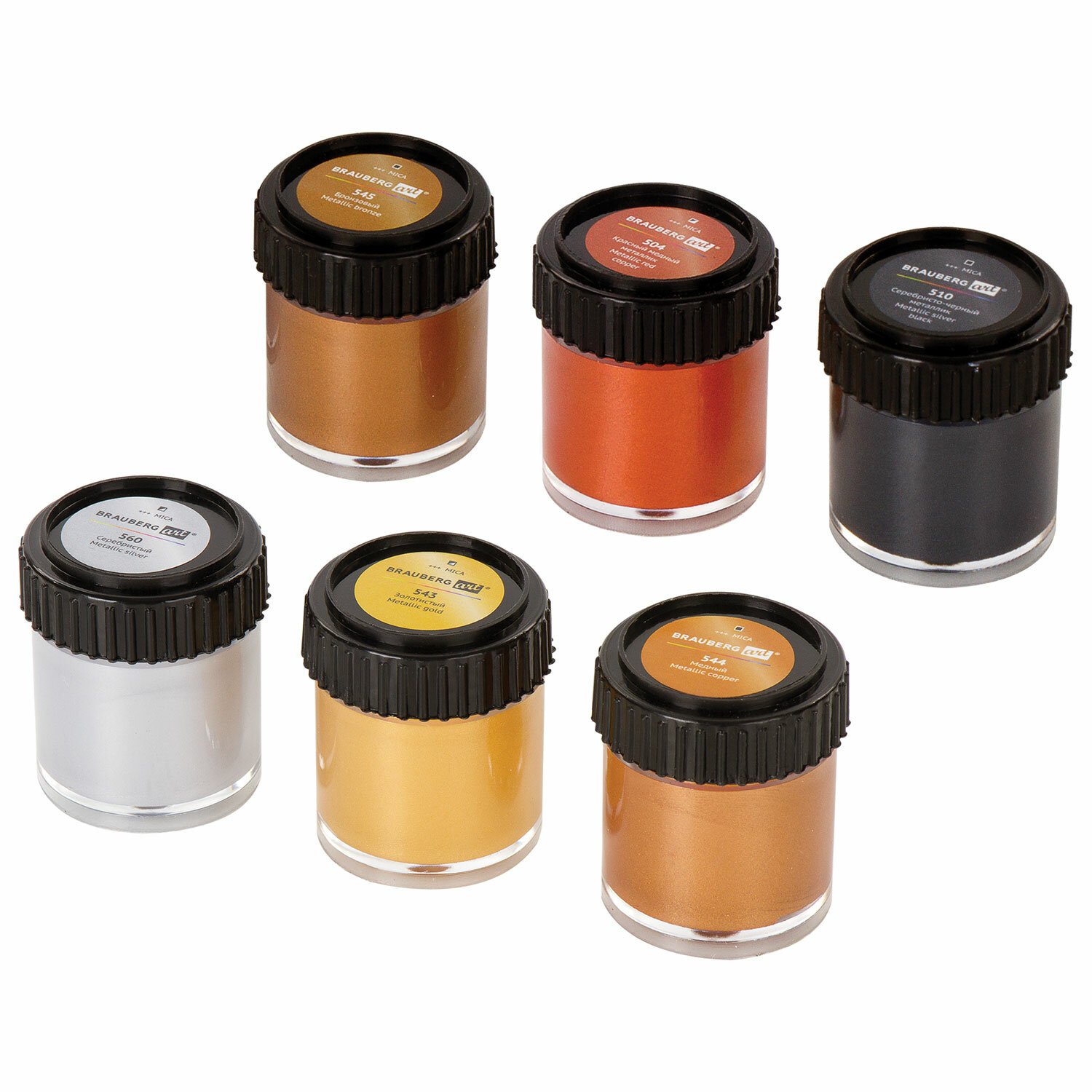 Краски с эффектом металлик. Легко наносятся практически на любую поверхность. Быстрое высыхание без изменения цвета. Отличная укрывистость и светостойкость. Разбавляются водой. Не токсичны и не имеют неприятного резкого запаха. Краски поставляются в банках объемом 22 мл в картонной коробке. В наборе 6 цветов: - золотистый (543); - серебристый (560); - медный (544); - бронзовый (545); - красный медный металлик (504); - серебристо-черный металлик (510).