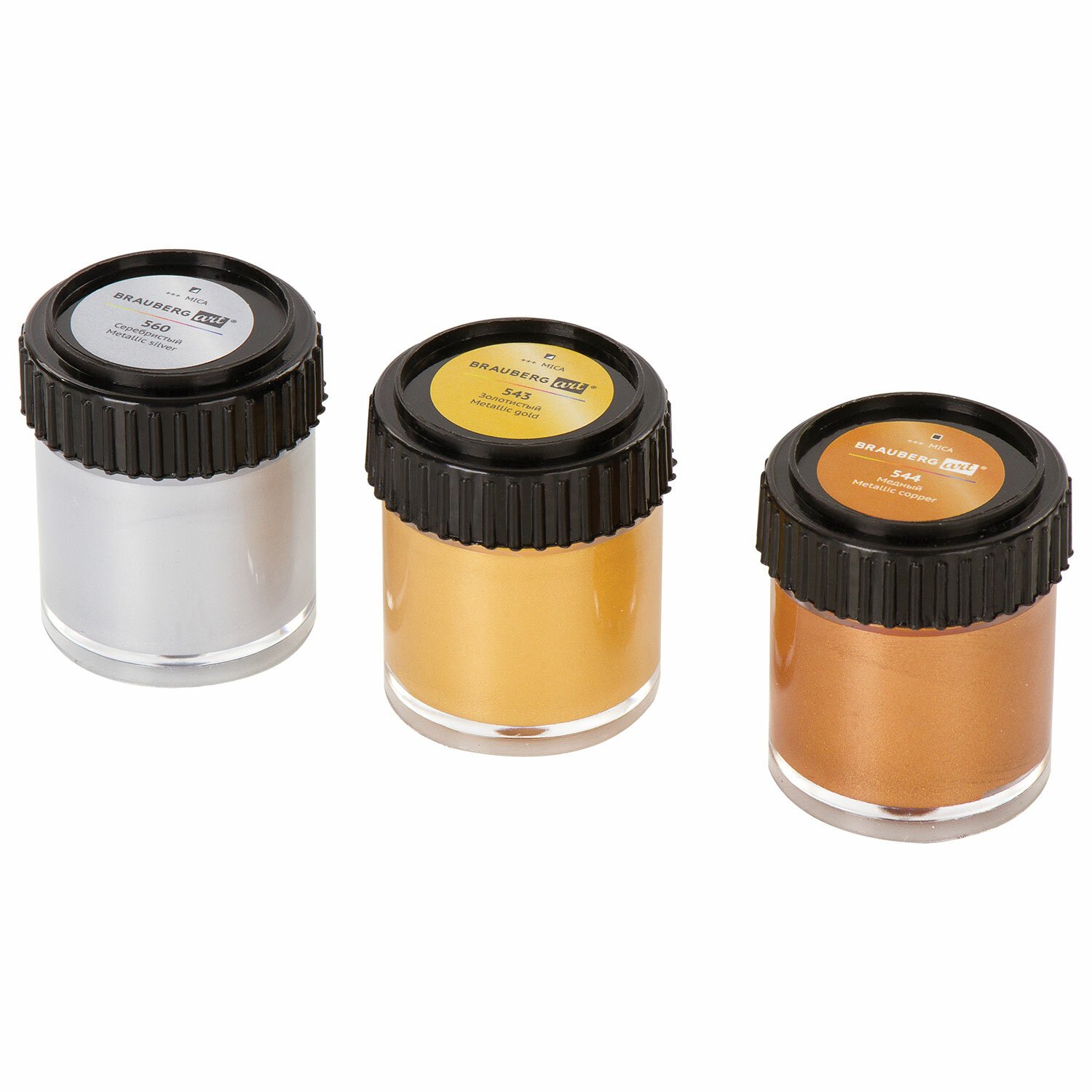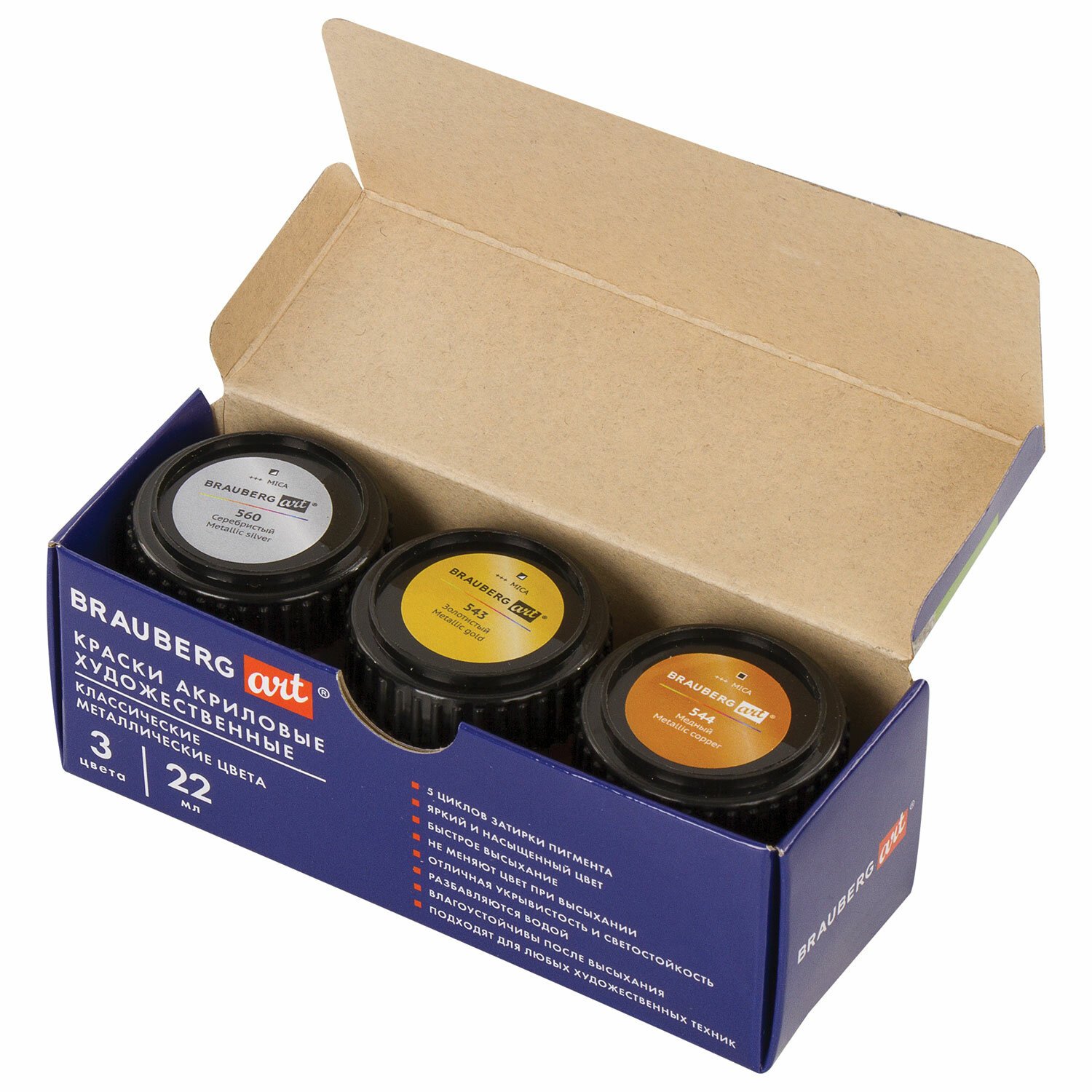 Краски акриловые художественные BRAUBERG ART CLASSIC, НАБОР 3 шт, МЕТАЛЛИК, в банках 22 мл, 191716