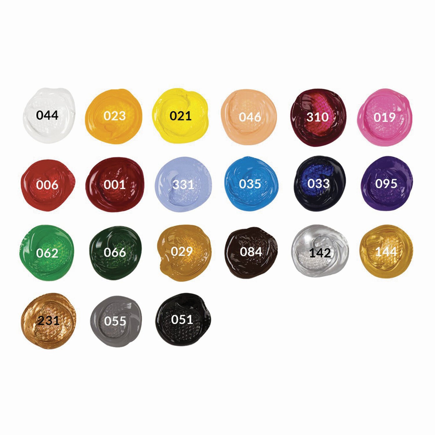 Краски с глянцевым финишем. Легко наносятся практически на любую поверхность. Быстрое высыхание без изменения цвета. Отличная укрывистость и светостойкость. Разбавляются водой. Не токсичны и не имеют неприятного резкого запаха. Краски поставляются в тубе объемом 75 мл в картонной коробке. В наборе 21 цвет: - белила титановые (044) - 3 шт.; - лимонная желтая (021); - желтая средняя (023); - телесная (046); - розовая светлая (019); - розовая (310); - киноварь (006); - красная темная (001); - серо-голубая светлая (331); - небесно-голубая (033); - ультрамарин (033); - фиолетовая средняя (095); - зеленая светлая (062); - травяная зеленая (066); - охра желтая (029); - умбра жженая (084); - серебристая (142); - золотистая (144); - перламутровая медно-золотая (231); - серая (055); - черная (051) - 2 шт.