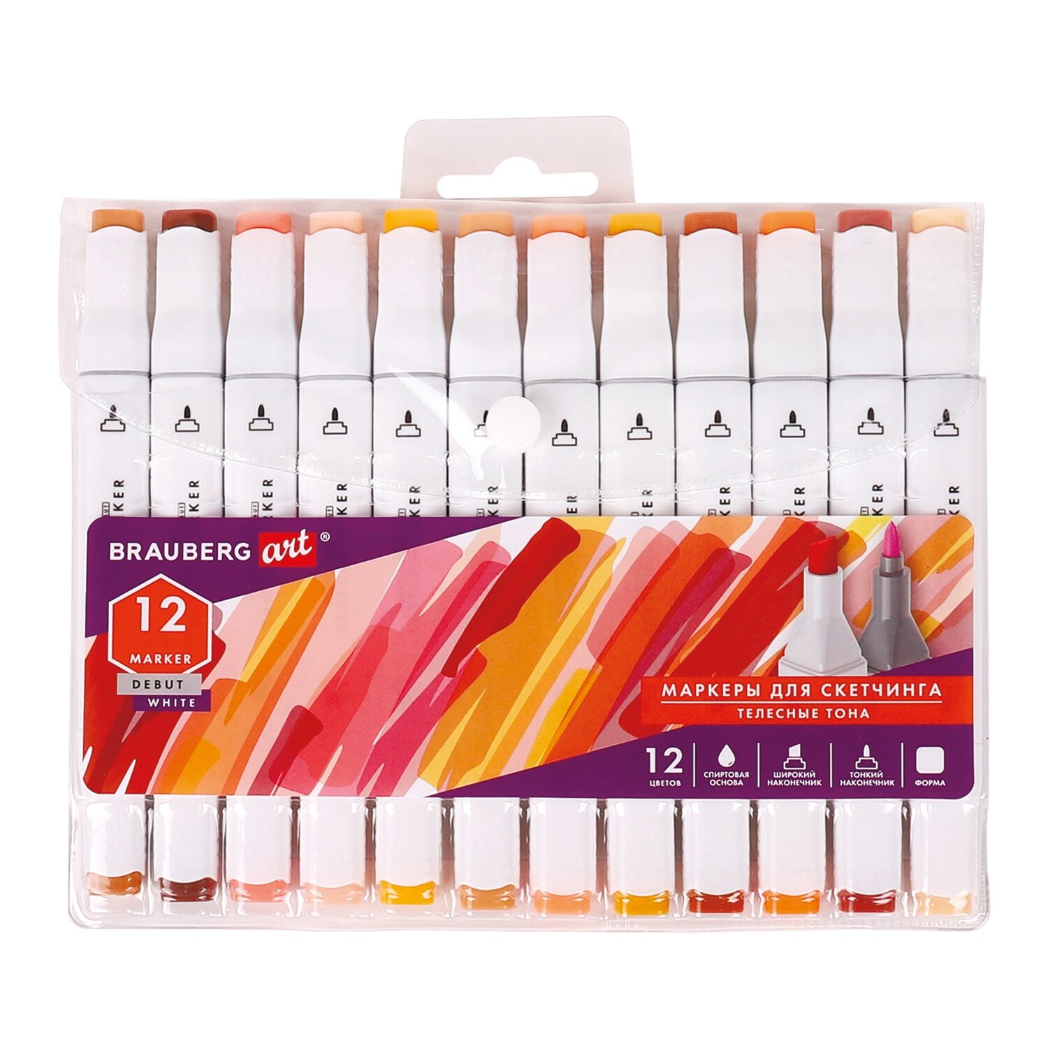 Маркеры для скетчинга двусторонние BRAUBERG ART DEBUT "WHITE", НАБОР 12 шт., телесные цвета, 152137