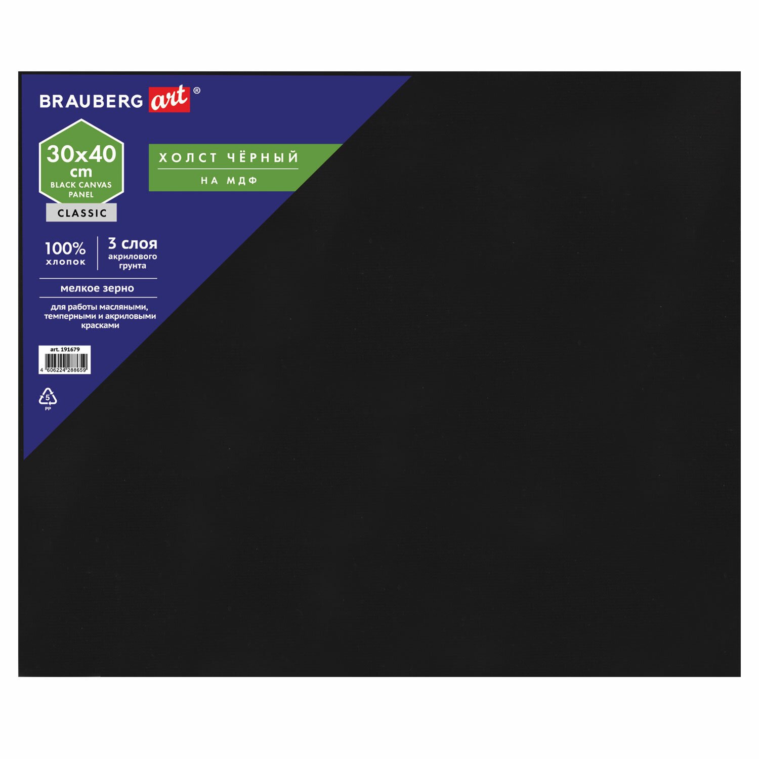 Холст черный на картоне (МДФ), 30х40 см, грунт, хлопок, мелкое зерно, BRAUBERG ART CLASSIC, 191679