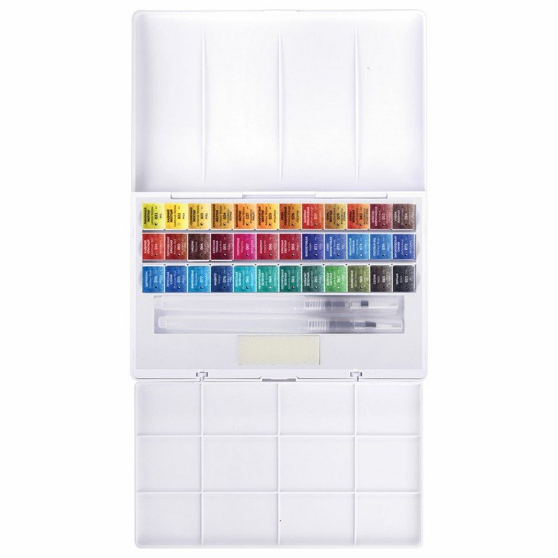 Акварельные краски созданы из высококачественных пигментов и гуммиарабика, без добавления примесей, что обеспечивает чистоту и насыщенность каждого цвета, а также получаемых при смешивании оттенков. Краски обладают отличной размываемостью и разносимостью, сохраняют оттенки после высыхания, высокоустойчивы к воздействию солнечного света. Акварель в кюветах поставляется в пластиковом пенале с палитрой, две кисти с резервуаром в комплекте. В наборе 36 цветов по 3,5 грамма: - лимонная желтая (021); - кадмий желтый (022); - солнечная желтая (023); - ауреолиновая желтая (024); - неаполитанская желтая (127); - золотистая желтая (025); - хром оранжевый (026); - шафран оранжевый (027); - охра желтая (029); - сиена жженая (082); - красно-коричневая (012); - умбра жженая (084); - кадмий красный (014); - персидская красная (002); - гикори (004); - красная темная (001); - пурпурная (007); - амарант (006); - красная светлая (003); - фиолетовая (071); - сине-фиолетовая (073); - океанская голубая (074); - голубая ФЦ (039); - оксфордская синяя (075); - церулеум (036); - прусская синяя (031); - бирюзовая (077); - индиго (076); - прусская зеленая (065); - нефритовая зеленая (064); - изумрудная зеленая (063); - кобальт зеленый (061); - зеленая светлая (062); - оливковая (069); - сепия (085); - черная (051). Художественные краски пригодятся как канцтовары школьникам, студентам, участникам мастер-классов, ученикам художественных школ, студий и училищ, живописных мастерских, так как у них представлена широкая гамма цветов. Отлично подойдут для работы дома или пленэре. С их помощью можно создать даже иллюстрации к сонетам Шекспира. Эти краски используют любители для хобби и профессионалы, которые стремятся достичь такой же славы как Пикассо (Picasso), Малевич, Шагал, Моне (Claude Monet), Рембрандт (Rembrandt), Дали (Salvador Dali), Уорхол (Andy Warhol), Рублёв, Фрида Кало (Frida Kahlo), Ван Гог (Vincent van Gogh), Тициан (Tician), Анри Матисс (Henri Matisse) Леонардо да Винчи (Leonardo da Vinci) и другие популярные художники и артисты. Творчество - луч света в серых буднях!
