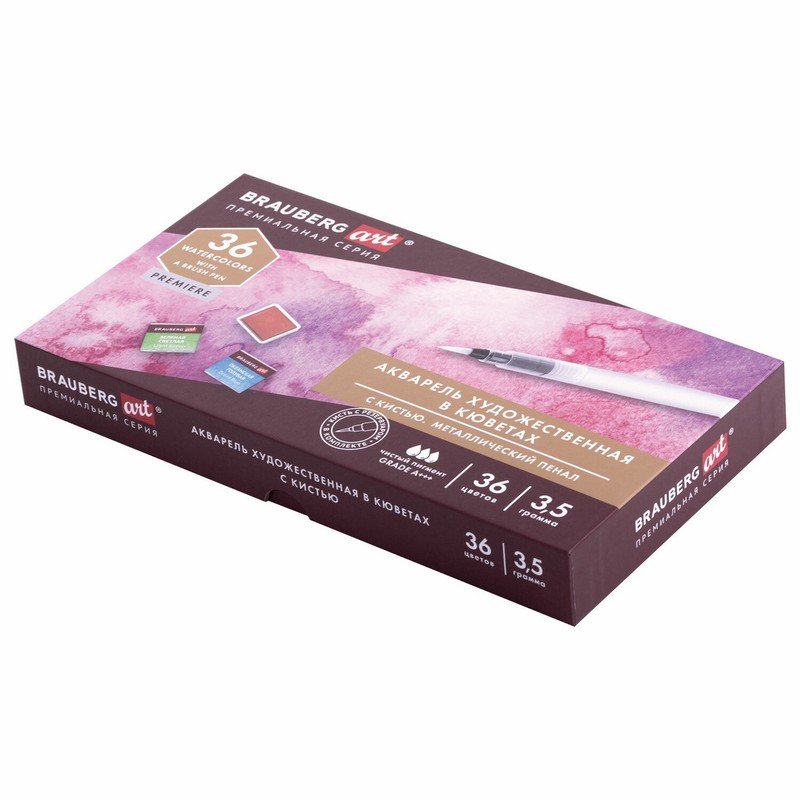 Акварель художественная кюветы НАБОР 36 цветов по 3,5 г, металлический кейс, BRAUBERG ART PREMIERE, 191774