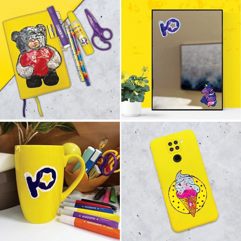 В набор витражных красок входят 6 неоновых непрозрачных красок (красный, розовый, салатовый, лимонный, черный, фиолетовый), светящихся в темноте в тубах по 20 мл, книга с шаблонами для рисования и пленка для предварительного создания аппликаций из красок. Готовые самоклеящиеся аппликации можно многократно переносить на любые гладкие поверхности. Для создания аппликации выберите шаблон и положите на горизонтальную поверхность, разместите сверху пленку, краской черного цвета сделайте контуры рисунка и оставьте на 3 часа подсохнуть. Когда контур стал матовым – залейте выбранные цвета внутрь контура и оставьте аппликацию подсыхать еще на 8 часов. Для получения желаемого оттенка при смешивании цветов можно воспользоваться зубочисткой (в комплект не входит). Перенесите застывшую аппликацию на гладкую вертикальную поверхность. Матовые непрозрачные краски ЮНЛАНДИЯ идеально подходят для создания наклеек, а качественные клеевые характеристики позволят надолго их закрепить на гладкой поверхности, что выгодно отличает их от обычных многоразовых наклеек. Поставляются в картонной упаковке с европодвесом.
