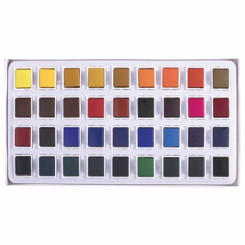 Акварельные краски созданы из высококачественных пигментов и гуммиарабика, без добавления примесей, что обеспечивает чистоту и насыщенность каждого цвета, а также получаемых при смешивании оттенков. Краски обладают отличной размываемостью и разносимостью, сохраняют оттенки после высыхания, высокоустойчивы к воздействию солнечного света. В наборе 36 цветов в кюветах по 2,5 грамма: - лимонная желтая (021); - кадмий желтый (022); - солнечная желтая (023); - ауреолиновая желтая (024); - неаполитанская желтая (127); - золотистая желтая (025); - хром оранжевый (026); - шафран оранжевый (027); - охра желтая (029); - сиена жженая (082); - красно-коричневая (012); - умбра жженая (084); - кадмий красный (014); - персидская красная (002); - гикори (004); - красная темная (001); - пурпурная (007); - амарант (006); - красная светлая (003); - фиолетовая (071); - сине-фиолетовая (073); - океанская голубая (074); - голубая ФЦ (039); - оксфордская синяя (075); - церулеум (036); - прусская синяя (031); - бирюзовая (077); - индиго (076); - прусская зеленая (065); - нефритовая зеленая (064); - изумрудная зеленая (063); - кобальт зеленый (061); - зеленая светлая (062); - оливковая (069); - сепия (085); - черная (051). Художественные краски пригодятся как канцтовары школьникам, студентам, участникам мастер-классов, ученикам художественных школ, студий и училищ, живописных мастерских, так как у них представлена широкая гамма цветов. Отлично подойдут для работы дома или пленэре. С их помощью можно создать даже иллюстрации к сонетам Шекспира. Эти краски используют любители для хобби и профессионалы, которые стремятся достичь такой же славы как Пикассо (Picasso), Малевич, Шагал, Моне (Claude Monet), Рембрандт (Rembrandt), Дали (Salvador Dali), Уорхол (Andy Warhol), Рублёв, Фрида Кало (Frida Kahlo), Ван Гог (Vincent van Gogh), Тициан ( Tician), Анри Матисс (Henri Matisse) Леонардо да Винчи (Leonardo da Vinci) и другие популярные художники и артисты. Творчество - луч света в серых буднях!