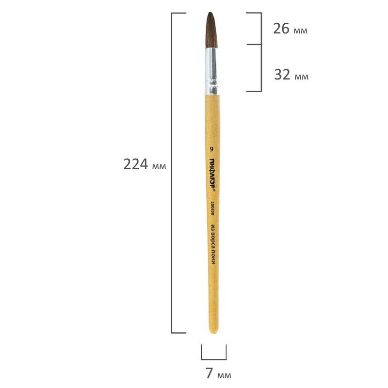 Кисть ПИФАГОР, ПОНИ, круглая, № 9, деревянная лакированная ручка, колпачок, пакет с подвесом, 200838