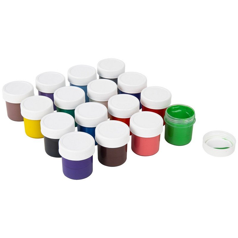 В наборе 16 ярких и насыщенных цветов: белый, красный, черный, синий, желтый, зеленый, коричневый, оранжевый, фиолетовый, светло-зеленый, голубой, розовый, красно-коричневый, охра, кармин, темно-зеленый. Краски полностью безопасны в использовании, не токсичны, без резкого запаха. Гуашь обладает высокой светостойкостью и укрывистостью, легко смешивается и размывается водой, хорошо наносится, без труда удаляется с рук и одежды. Краски разлиты в пластмассовые герметичные баночки объемом 20 мл. Общий объем - 320 мл.