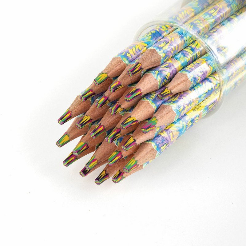 Необычный грифель карандаша сочетает в себе четыре цвета - жёлтый, фиолетовый, розовый, салатовый. Утолщенный шестигранный корпус позволяет не скатываться карандашу с поверхности стола во время занятий рисованием и комфортно располагается в руке ребенка. Карандаш изготовлен из высококачественной древесины. Корпус покрыт цветной печатью. Мягкий грифель диаметром 5 мм из натуральных материалов и пигментов обладает повышенной прочностью. Карандаши упакованы в пластиковую прозрачную тубу с красочным стикером.