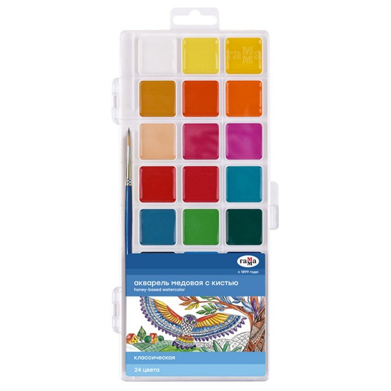 Краски акварельные ГАММА "Классическая", 24 цвета, медовая, c кистью, пластиковая коробка, европодвес, 1009203