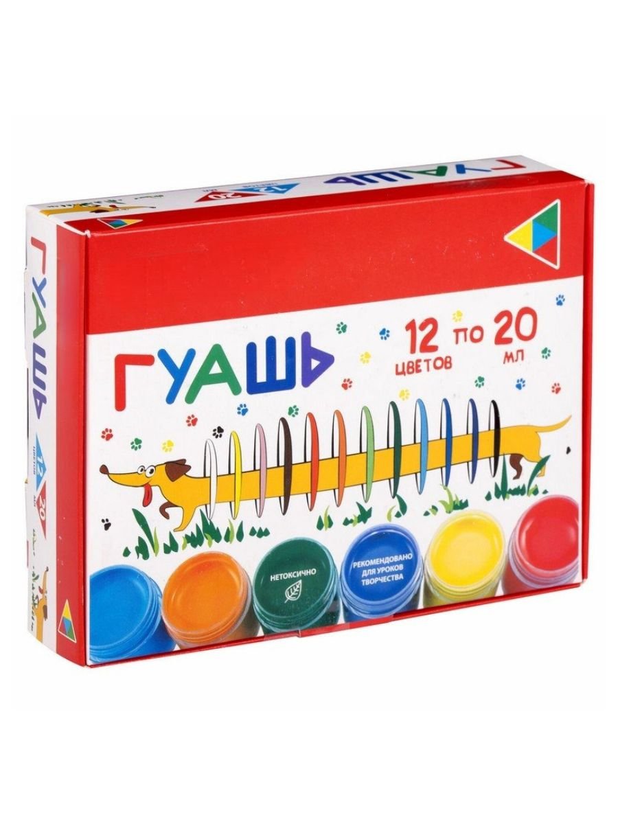 В наборе 12 ярких цветов: белый, черный, красный, желтый, синий, зеленый, оранжевый, фиолетовый, голубой, розовый, светло-зеленый, коричневый. Краски полностью безопасны в использовании, не токсичны и не имеют резкого запаха. Гуашь обладает высокой светостойкостью и укрывистостью, легко размывается водой, хорошо наносится, без труда удаляется с рук и одежды. Краска находится в пластмассовой герметичной баночке объемом 20 мл. Общий объем - 240 мл. Ребенок сможет легко открыть баночки с винтовыми крышками без помощи взрослых.