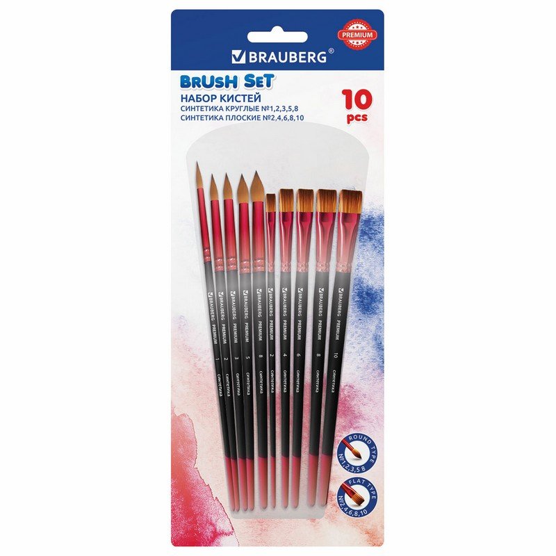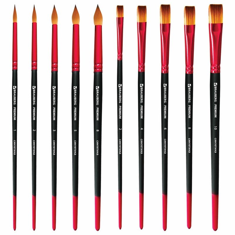 Кисти BRAUBERG PREMIUM, набор 10 шт. (синтетика, круглые № 1, 2, 3, 5, 8, плоские № 2, 4, 6, 8, 10), 201027