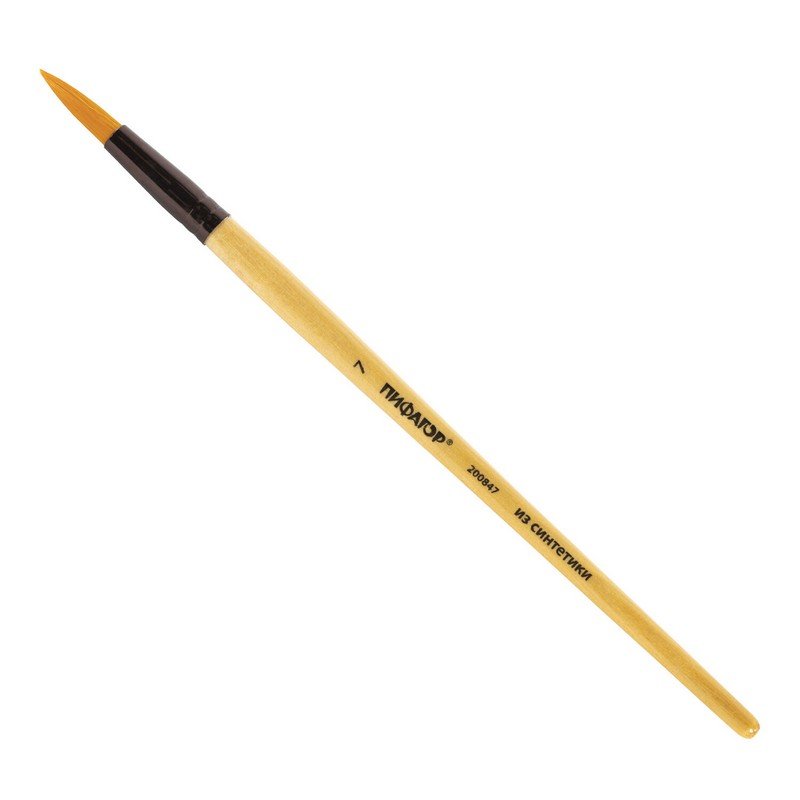 Кисть ПИФАГОР, СИНТЕТИКА, круглая, № 7, деревянная лакированная ручка, с колпачком, пакет с подвесом, 200847