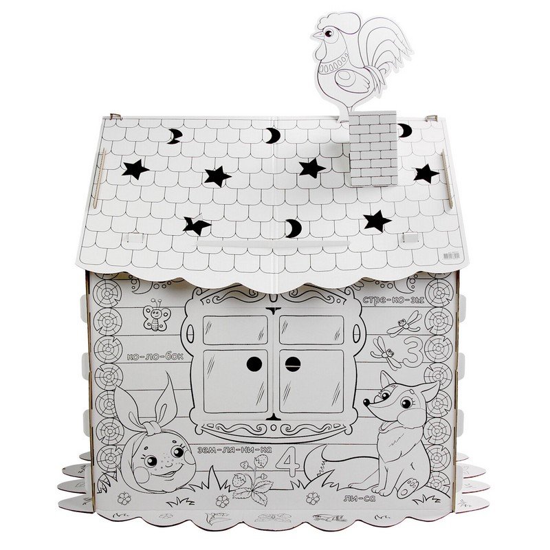 Домик-раскраска изготовлен из 100% безопасного, экологически чистого материала – гофрированного картона. Состоит из 7 деталей: 4 стен, крыши, трубы и флюгера, которые очень просто собираются и крепятся между собой без клея и ножниц. Все стороны домика разные по дизайну. Толстый контур рисунков поможет малышу аккуратно их раскрасить любыми фломастерами, красками, карандашами, восковыми мелками. Полянка вокруг домика не даст испачкать ковер или пол красками. Все края домика имеют закругленную форму и безопасны для ребенка. В крыше имеются отверстия в виде звезд и месяцев. При внутренней подсветке ночником происходит проекция звездного неба на потолок комнаты. В дизайне домика задействованы буквы, цифры, цвета, добрые персонажи и многое другое. Домик можно использовать и как личное пространство для ребёнка, и как раскраску, и как развивающую игрушку, и как предмет интерьера. Внутренние размеры домика: 95х75х104 см, внешние размеры домика: 123х103х130 см. Домик-раскраска сертифицирован и безопасен для детей.