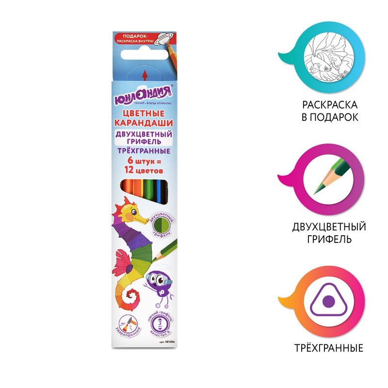 Карандаши цветные с двухцветным грифелем ЮНЛАНДИЯ "МОРСКИЕ ЖИТЕЛИ", 12 цветов, 6 штук, 181586