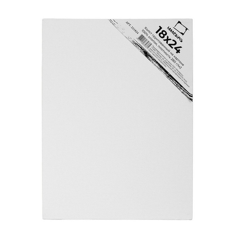 Холст на картоне Малевичъ, 18x24 см. Отличный выбор для студентов и мастеров-художников. Представляют собой профессионально натянутые на картон толщиной 3 мм грунтованные мелкозернистые холсты из натурального хлопка плотностью 280 г/кв. м, позволяющие сразу же приступить к работе. Такие полотна дешевле и прочнее холстов на подрамнике и особенно удобны для работы на пленэре.