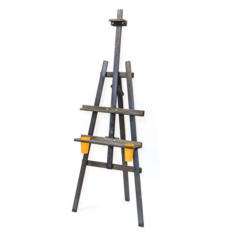 Мольберт Лира "Комфорт" с покрытием, черный. Мольберт Лира классической конструкции из натурального дерева. Угол наклона опорной ноги можно изменять, высота полки и фиксатора холста также регулируется. Ширина полки 55 см, глубина полки 3,5 см. Оснащен дополнительной широкой полкой (глубина 11,5 см) для инструментов с отверстиями для стаканов с водой или кистей (стаканы входят в комплект). Вторая полка также позволяет работать с двумя холстами одновременно (например при создании копий). Бюджетный вариант мольберта с улучшенной функциональностью. Покрыт морилкой черного цвета. Высота 170 см, ширина 55 см, глубина от 20 до 120 см. Вес 5,1 кг. Ширина полки 55 см, глубина полки 3,5 см. Глубина дополнительной полки 11,5 см. Максимальная высота холста 120 см