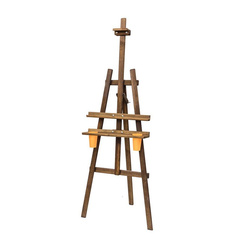 Мольберт Лира "Комфорт" с покрытием, коричневый. Мольберт Лира "Комфорт" классической конструкции из натурального дерева. Угол наклона опорной ноги можно изменять, высота полки и фиксатора холста также регулируется. Оснащен дополнительной широкой полкой для инструментов с отверстиями для стаканов с водой или кистей (стаканы входят в комплект). Вторая полка также позволяет работать с двумя холстами одновременно (например при создании копий). Бюджетный вариант мольберта с улучшенной функциональностью. Покрыт морилкой коричневого цвета. Высота 170 см, ширина 55 см, глубина от 20 до 120 см. Вес 5,1 кг. Ширина полки 55 см, глубина полки 3,5 см. Глубина дополнительной полки 11,5 см. Максимальная высота холста 120 см