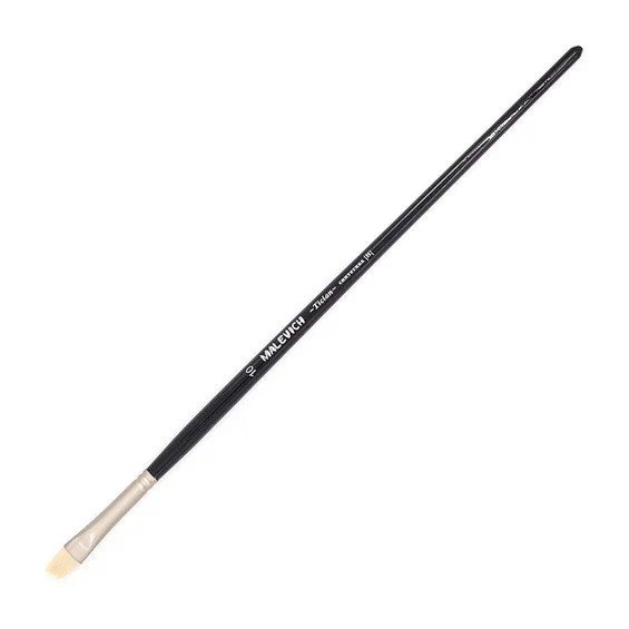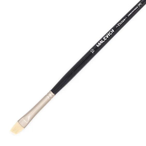 Кисть из синтетики Tician, скошенная №10. Кисть из серии Tician изготовлена из жесткой синтетики белого цвета имитирующей щетину. Этот ворс отлично подходит для густых красок таких как масло, акрил, гуашь, темпера. Кисть выполнена в благородной цветовой гамме. Матовая втулка с теплым металлическим оттенком, черный лак и лаконичная маркировка делают эту кисть не только надежным художественным инструментом, но и красивым аксессуаром. Кисть держит свою форму даже при частом использовании, ворс прочно закреплен, а втулка не расшатывается со временем. Ручка кисти длинная - 25 см. Длина ворса (выставка) короткая. Номер кисти соответствует диаметру в мм.