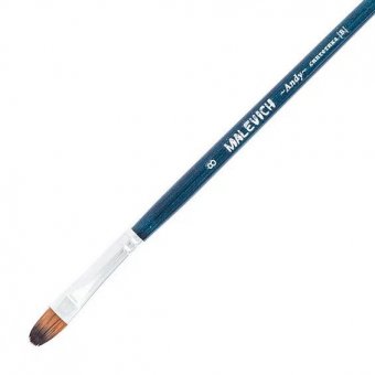 Кисть из синтетики Andy, плоскоовальная №8. Кисть из синтетики серии Andy - это мягкая универсальная синтетика, которая подходит практически для любых видов красок. Ей удобно работать с гуашью, акварелью, акрилом, темперой. Маслом можно работать в лессировочной технике с разбавителем. Синтетика рыжего цвета с темным кончиком, ручка покрыта синим лаком, ворс закреплен аллюминиевой втулкой с двойной обжимкой. Ручка кисти короткая - 14 см. Длина ворса (выставка) короткая. Номер кисти соответствует диаметру в мм.