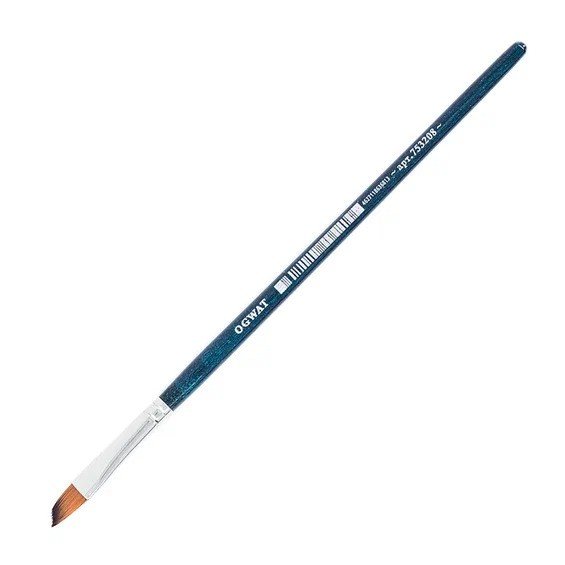 Кисть из синтетики Andy, скошенная №8. Кисть из синтетики серии Andy - это мягкая универсальная синтетика, которая подходит практически для любых видов красок. Ей удобно работать с гуашью, акварелью, акрилом, темперой. Маслом можно работать в лессировочной технике с разбавителем. Синтетика рыжего цвета с темным кончиком, ручка покрыта синим лаком, ворс закреплен аллюминиевой втулкой с двойной обжимкой. Ручка кисти короткая - 14 см. Длина ворса (выставка) короткая. Номер кисти соответствует диаметру в мм.