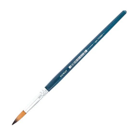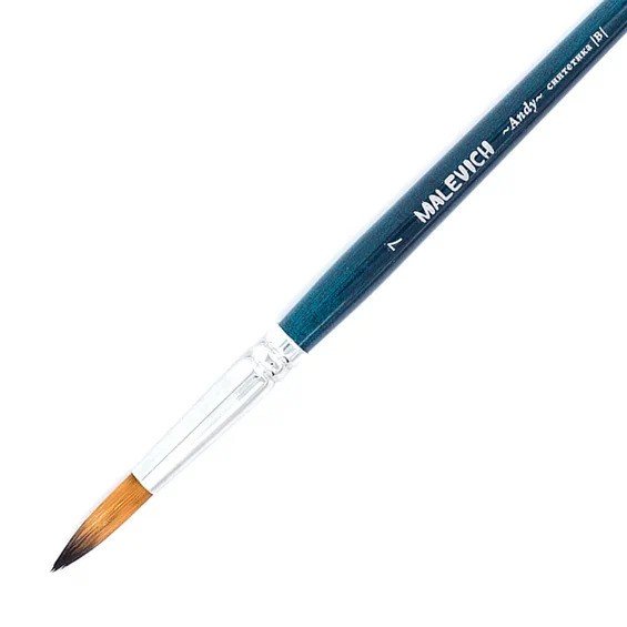 Кисть из синтетики Andy, круглая №7. Кисть из синтетики серии Andy - это мягкая универсальная синтетика, которая подходит практически для любых видов красок. Ей удобно работать с гуашью, акварелью, акрилом, темперой. Маслом можно работать в лессировочной технике с разбавителем. Синтетика рыжего цвета с темным кончиком, ручка покрыта синим лаком, ворс закреплен аллюминиевой втулкой с двойной обжимкой. Ручка кисти короткая - 14 см. Длина ворса (выставка) короткая. Номер кисти соответствует диаметру в мм.