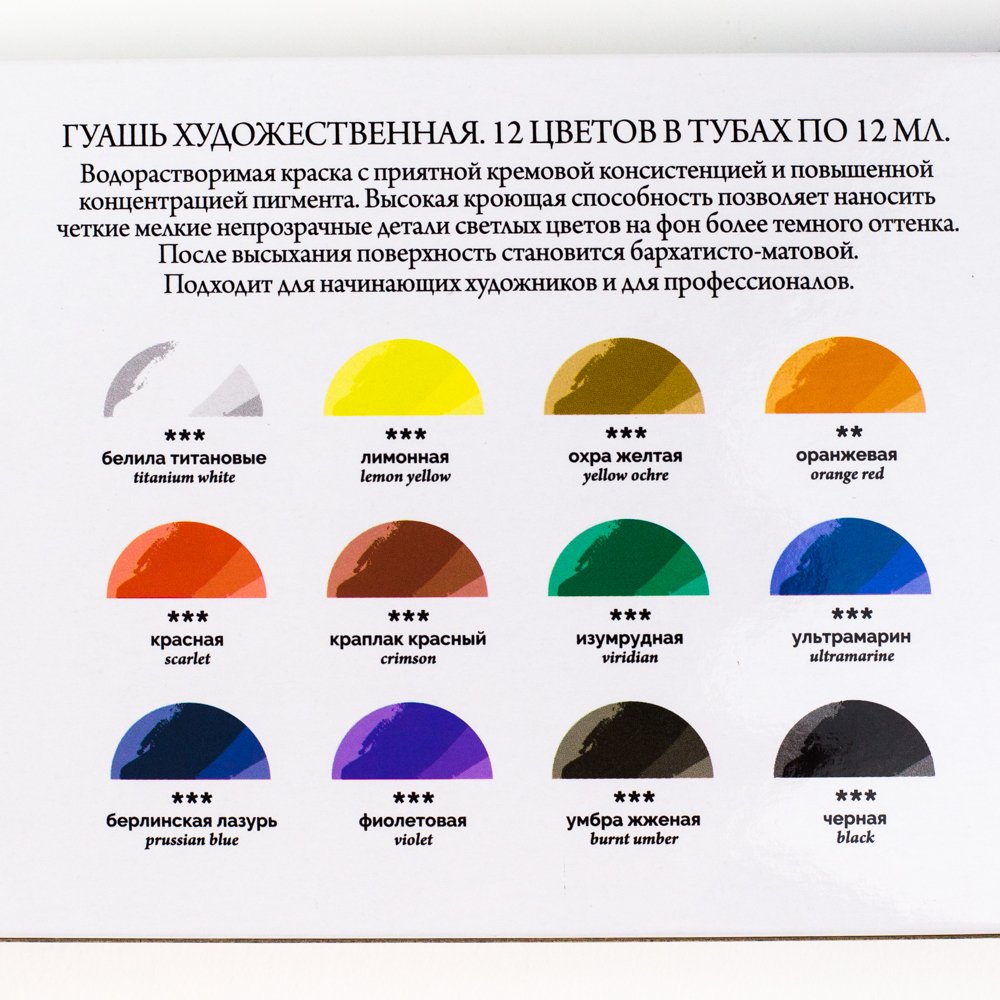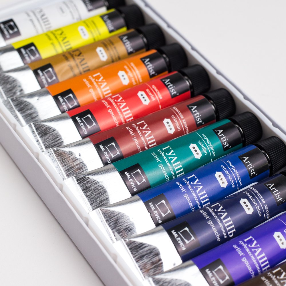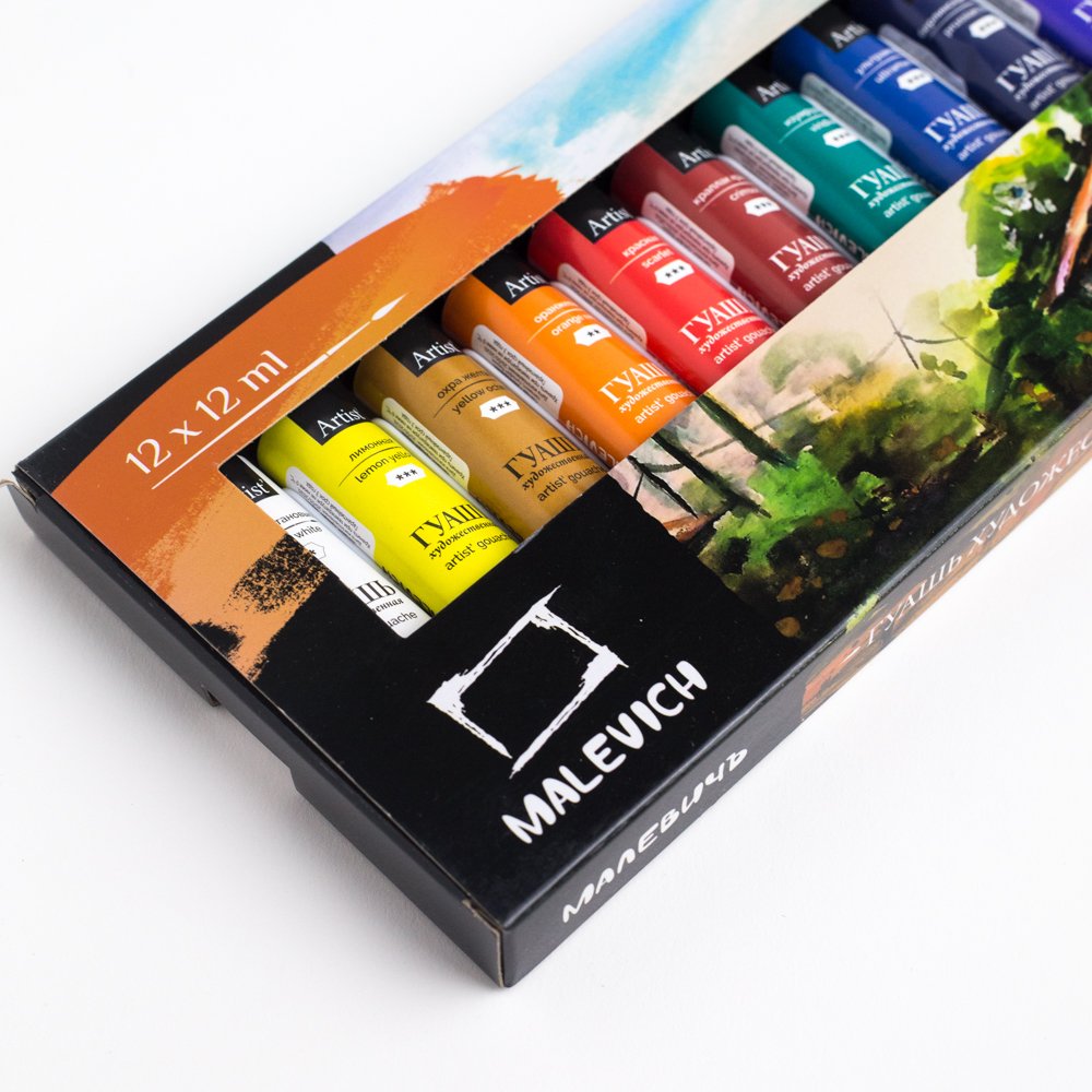 Набор гуаши Малевичъ, 12 цветов по 12 мл. Водорастворимая, комфортная для работы краска с приятной кремовой консистенцией и повышенной концентрацией пигмента. Высокая кроющая способность позволяет наносить четкие мелкие непрозрачные детали светлых тонов на фон темного оттенка. После высыхания поверхность становится бархатисто-матовой. Подходит как для начинающих, так и для профессиональных иллюстраторов. Удобный формат для тех, кто любит рисовать на пленерах и скетчить в городе. Гуашь просто выдавить, просто смешать и рисовать.