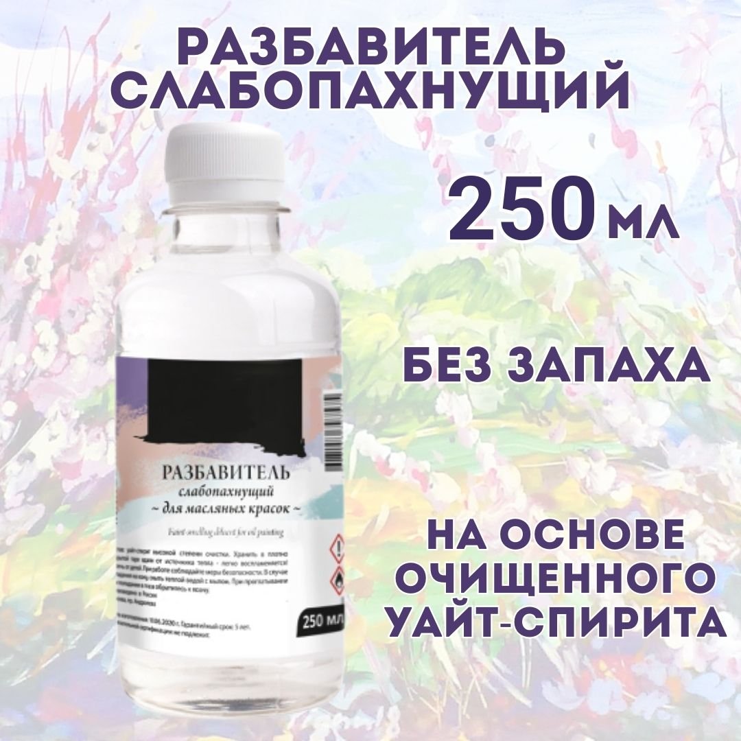 Разбавитель слабопахнущий ArtPinOk, 250 мл. Разбавитель на основе очищенного уайт-спирита не обладает ярко выраженным химическим запахом, поэтому прекрасно подходит для длительной работы в закрытом помещении. Используется для придания масляным краскам нужной консистенции, а также легко справляется с очисткой кистей и палитр. Изготовлен из уайт-спирита, прошедшего специальную очистку, и расфасован в удобную экономичную упаковку с безопасной крышкой объемом 250 мл. Идеально подходит для длительной работы в закрытом помещении, а также для людей с тонким обонянием, поскольку не имеет неприятного запаха. Разбавитель без запаха прозрачен, хорошо разбавляет масляную краску, не желтеет со временем и ускоряет время высыхания живописного слоя.