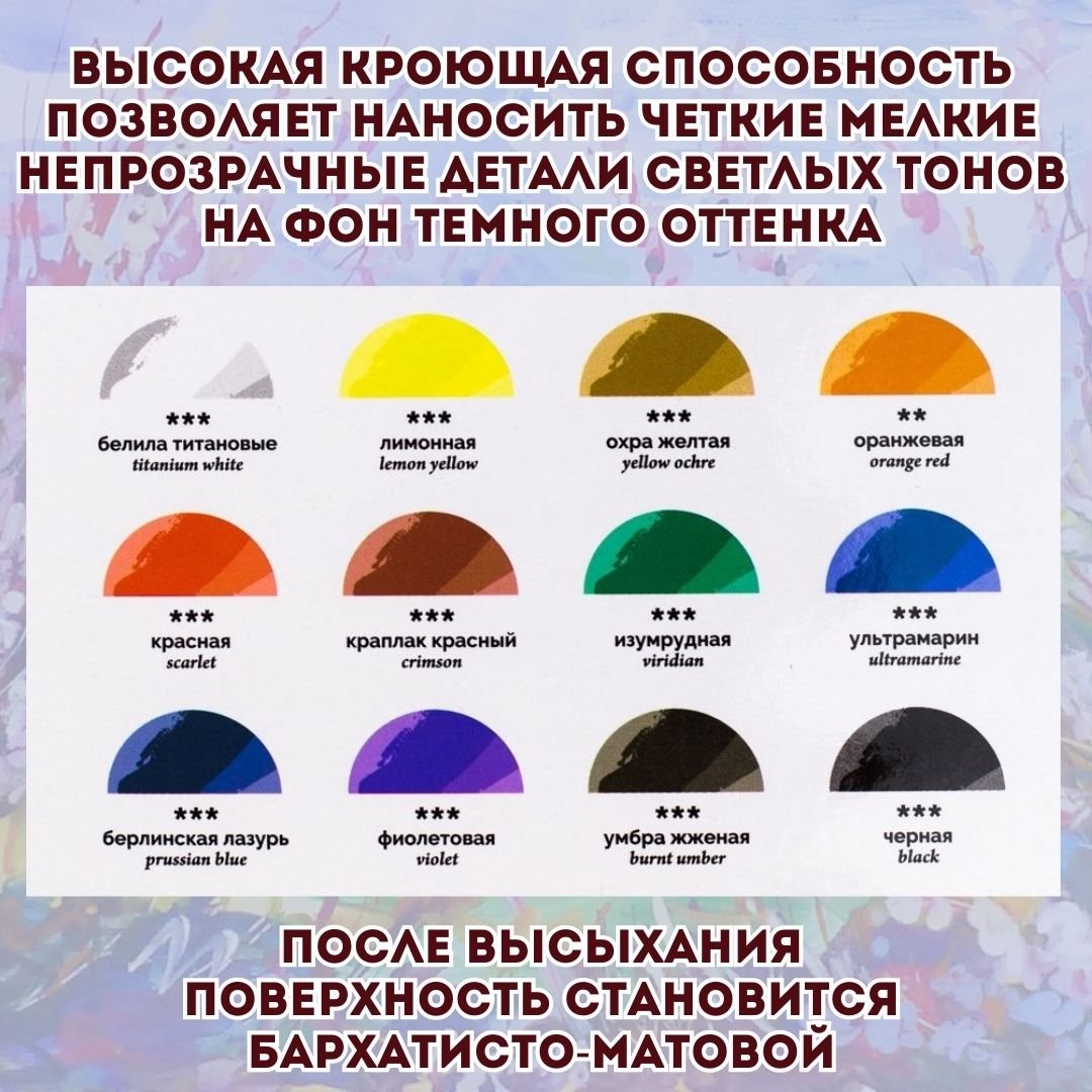 Набор художественной гуаши 12 цветов по 12 мл. Яркие, насыщенные оттенки для профессионального творчества и учебы.
